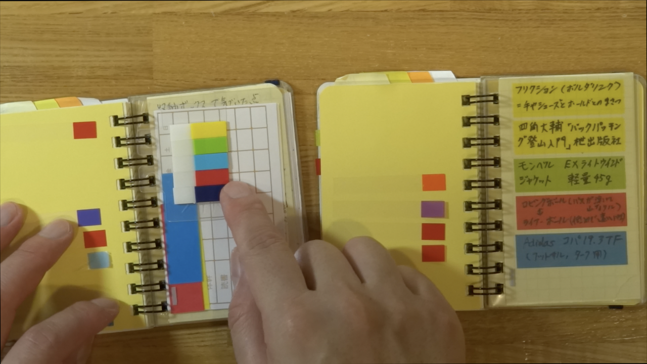 でもこのフィルム付箋を少しページからはみ出させるようして貼ることで、ロルバーンを閉じた状態でも、付箋やその色を目印にしてスムーズに該当するメモのページを開くことができました。しかも色のついた部分もふくめて半透明なので、書いてあるメモを隠してしまうことがなかったのも便利でした。