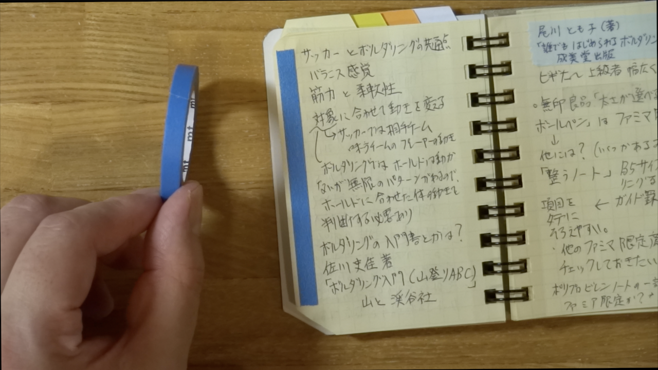 たとえばオレンジ色のテープは「雨天時のサッカーの試合での注意ポイント」というテーマのメモだけに貼る、って感じです。このときに細いマステだと、書いてある文を隠すことがなくて邪魔にならないので、とても都合がよかったです。