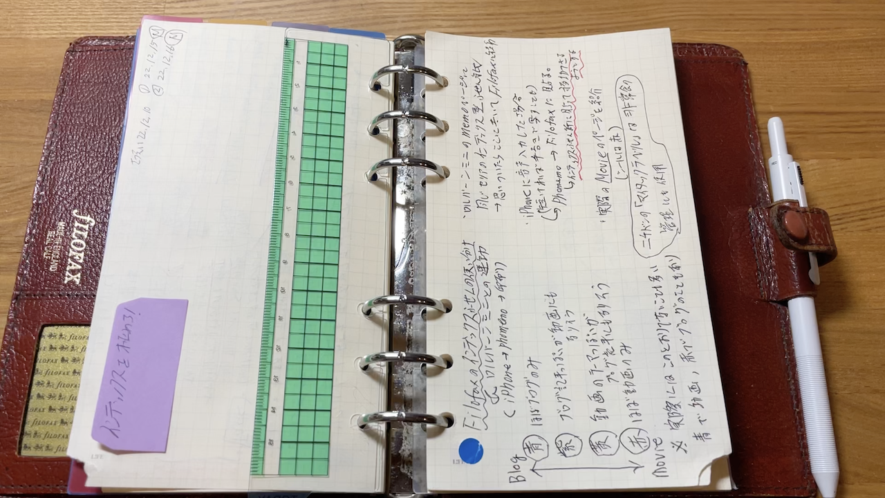 自分がシステム手帳を使うことになるとは、今年の夏までは全然思ってなかったですが、今ではこのファイロファックスのWinchesterがすごく大切な存在になっています。いわゆる普通のシステム手帳の使い方とはかなり違いますが、ブログや動画を生み出すためのペースメーカー的な存在になっていて、これを使い出してから、特に動画に関しては撮影、編集、投稿をリズム良くできるようなルーティンが確立できたと思っています。