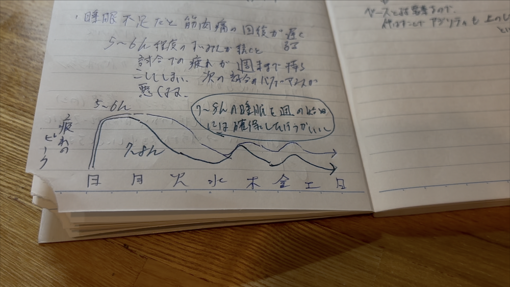 ただ、メモの量自体は決して多くないと思います。毎日何ページ書く、みたいなノルマは自分に課しておらず、何も書かない日もあります。あと、ライフログ的(何をやったかなど)なことも書いていません。どちらかというと、書くことで今後、スポーツや生活の改善につながりそうなことをメモして、それを実践していくために書いている、というのが僕の手帳の使い方の特徴かもしれません。